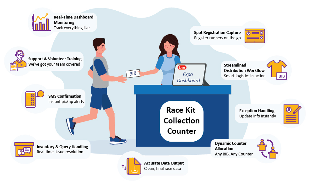 Solution : ‘Company A’ used the RACES Runners Kit Management system in their next event to manage the runner's kit management process. It effortlessly resolved the issue by recording and storing the participants' data using real-time technology.‘Company A’ had all the data of participants who had collected and the names of participants who had not collected goodie bags to sort out the problem in a systematic manner.