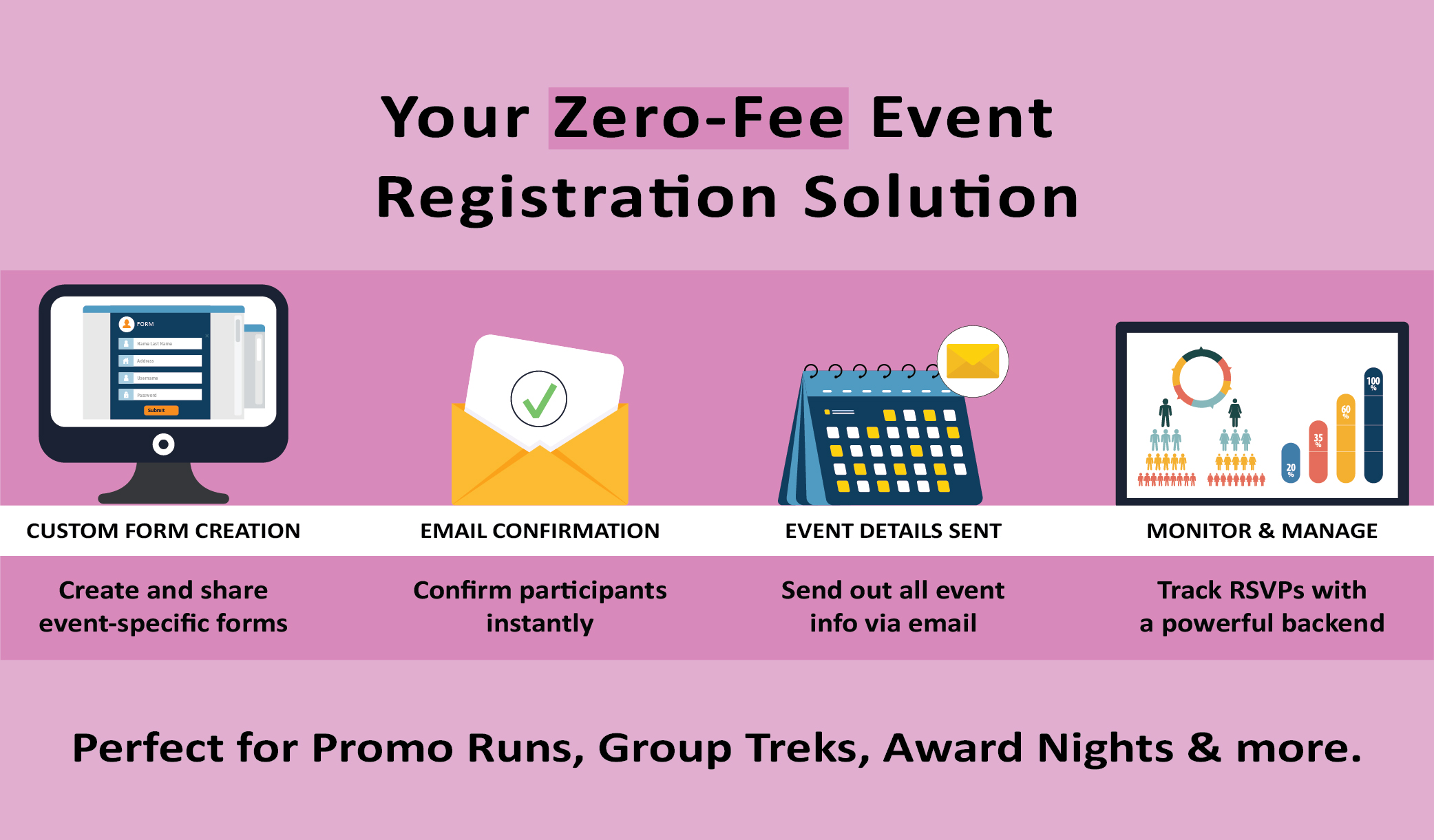 RACES RSVP is a streamlined solution designed specifically for fee-free on-site events, including promo runs, training sessions, group picnics, treks, and celebratory award dinners. It simplifies the registration process and ensures smooth event management without any fees.